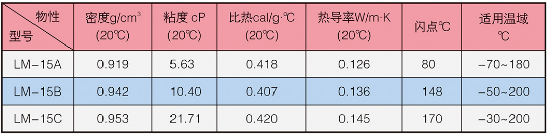 LM-15系列冰河冷媒由聚硅氧烷改性而成。外观为无色或浅色液体,不溶于水。具有生理惰性、良好的化学稳定性、凝固点低、使用寿命长等特点,对以金属为代表的众多材料,几乎不会产生不良的影响,可应用于医药、化工、新能源等领域的制冷系统。